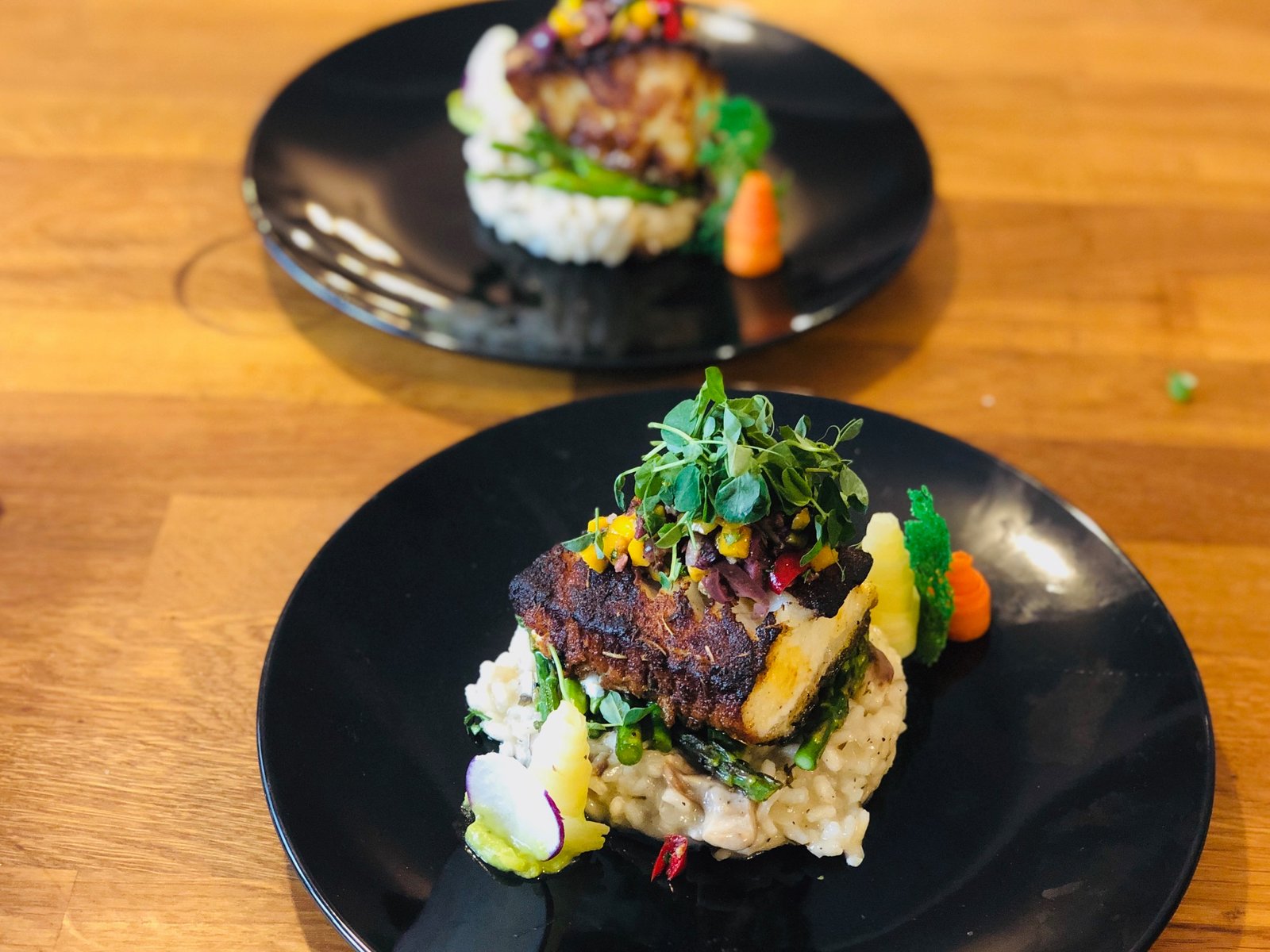 Grilled Cajun Sea Bass fillet with mango salsa, shiitake mushrooms risotto & grilled asparagus