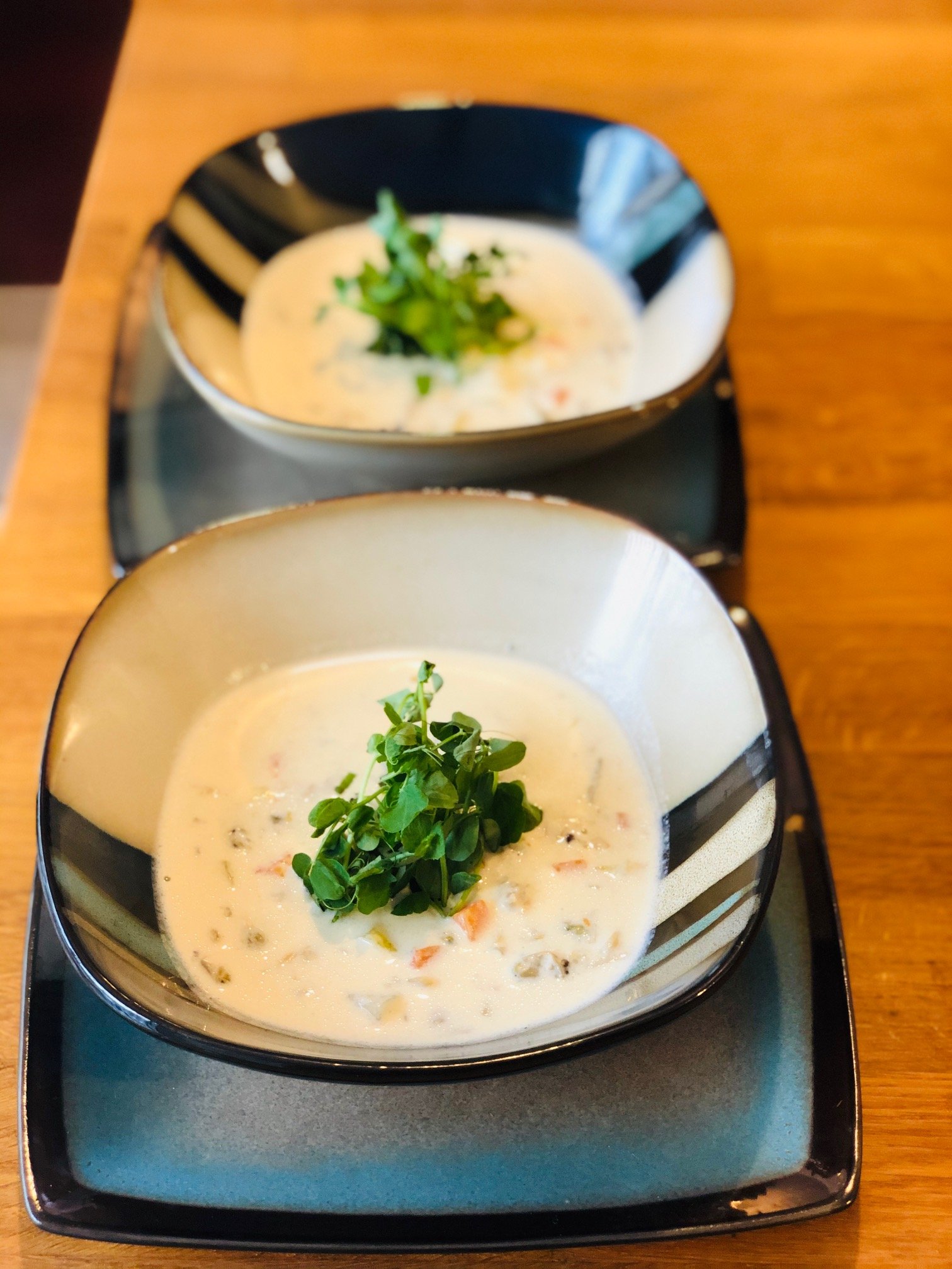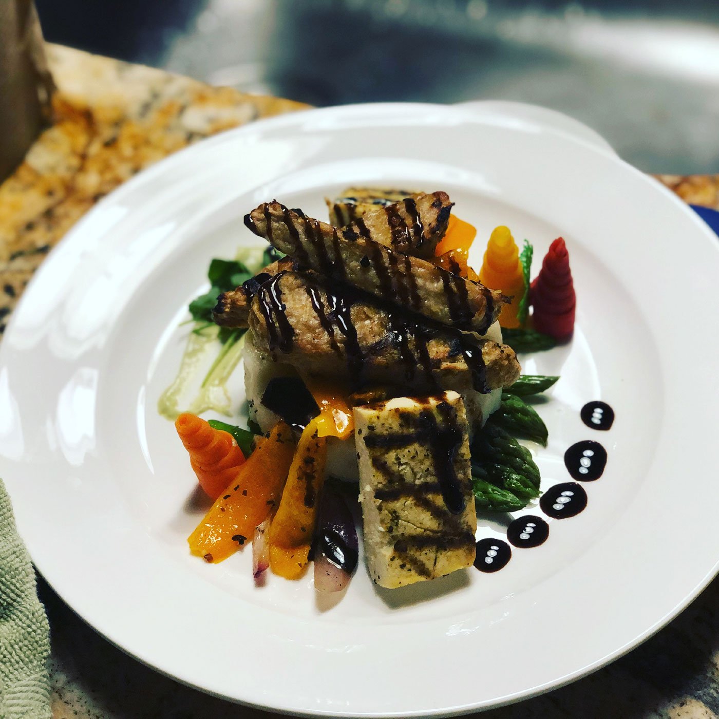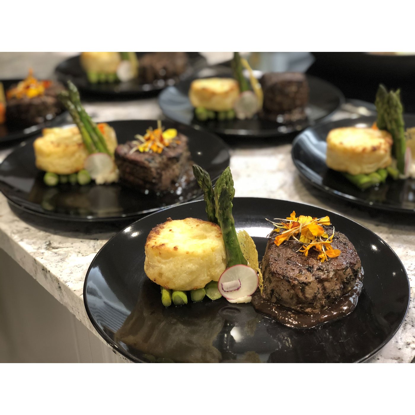 No hormone & grass fed 6 oz beef tenderloin with butter poached Lobster tail, creamy garlic & leek sauce, nutmeg chives mashed potatoes, and maple glazed grilled zucchini.