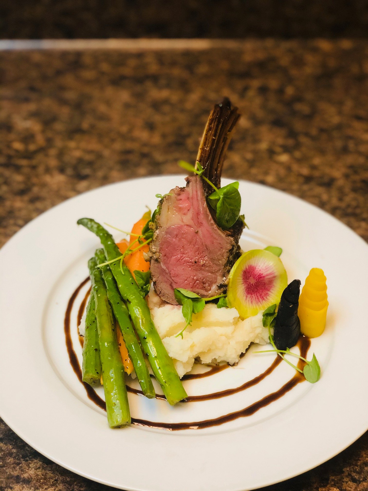 Walnut Dijon lamb rack ( 3 bones per person ) mash potatoes and asparagus