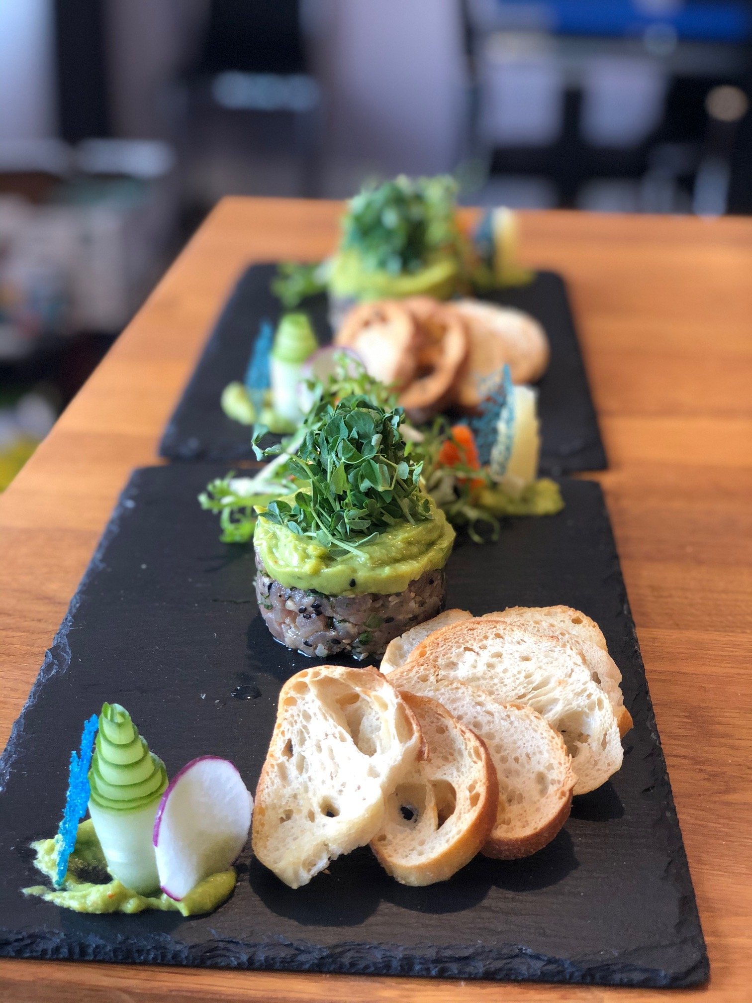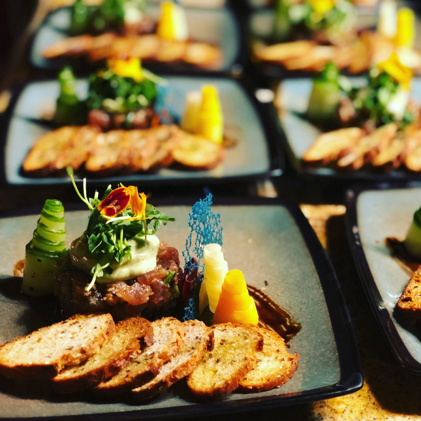Yellow tail tuna tartare with avocado, black sesame seeds and crostini