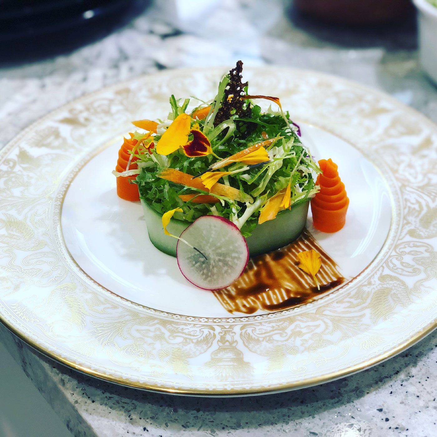 Organic greens , buratta soft cheese in cucumber ring, roasted peaches. Olive oil and balsamic dressing