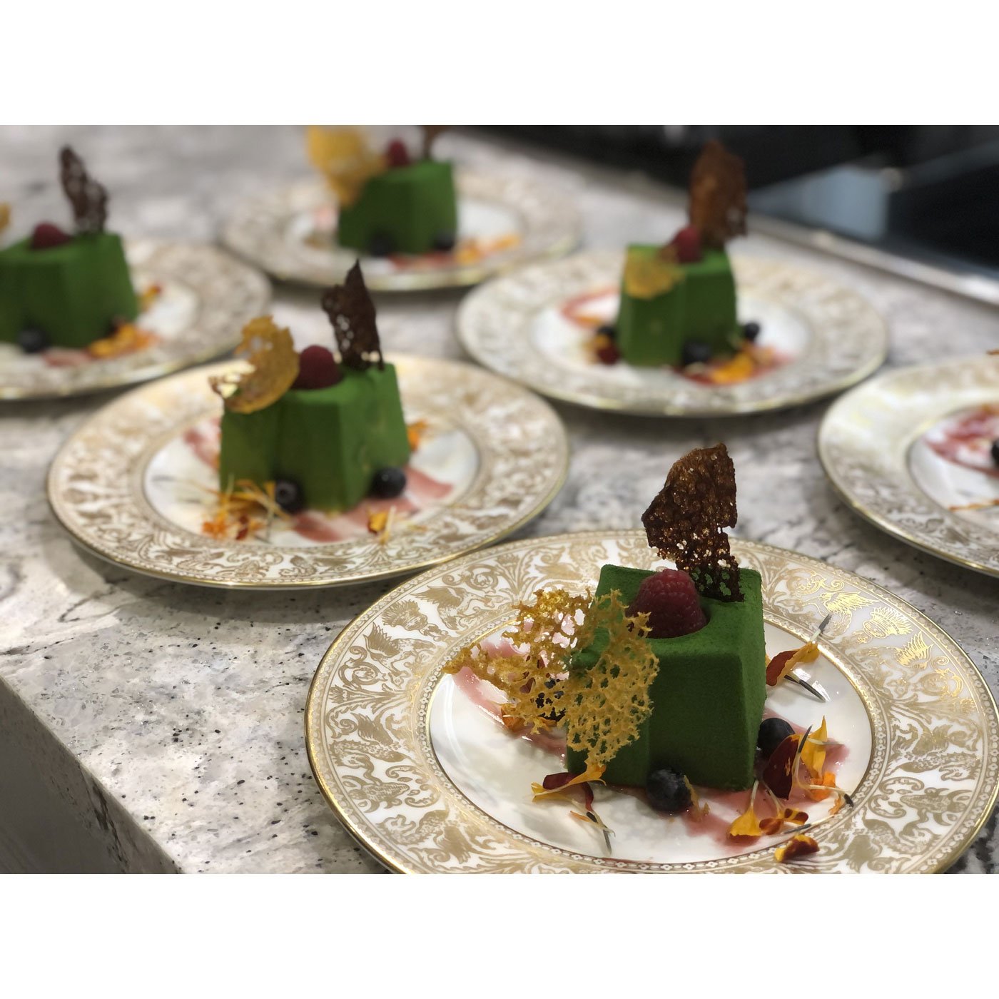 Pistachio mousse cake with raspberry coolie and fruit garnish